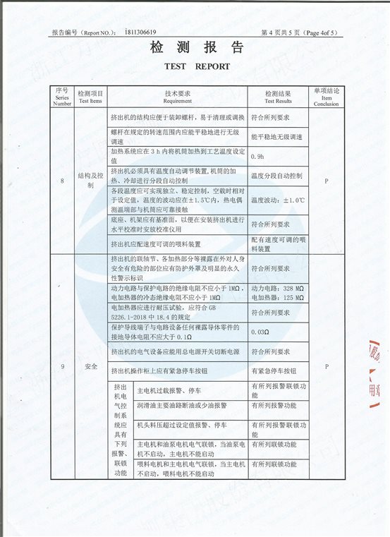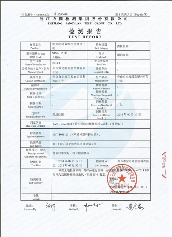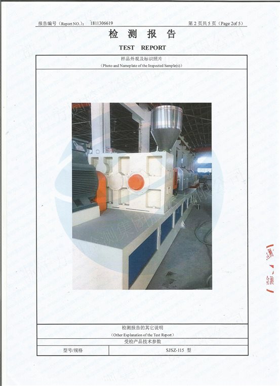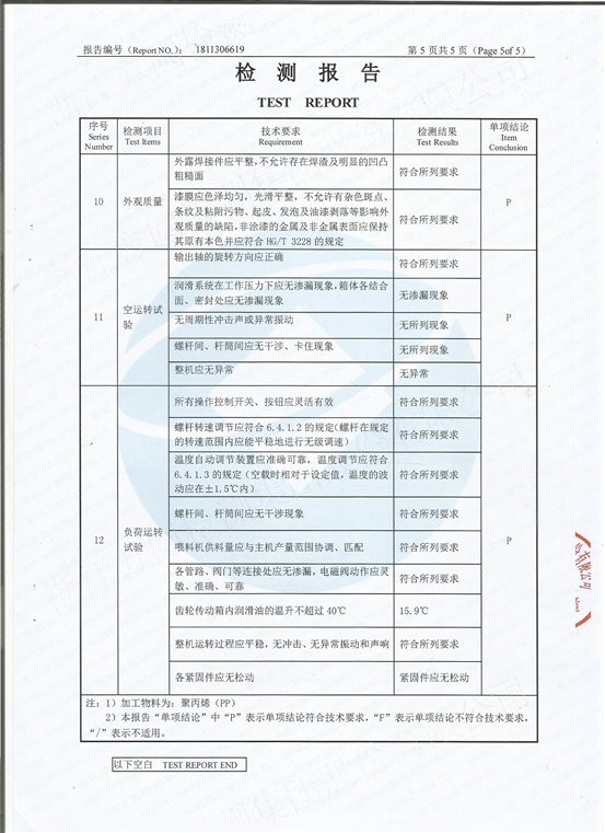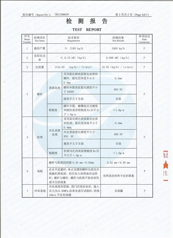 近期,我公司自主研制的SJSZ115型錐形同向雙螺桿擠出機(jī)試機(jī)成功,樣機(jī)通過(guò)浙江方圓檢測(cè)集團(tuán)權(quán)威檢測(cè),經(jīng)檢測(cè),每小時(shí)產(chǎn)量可達(dá)2469公斤,實(shí)際比功率0.098!具體檢測(cè)報(bào)告如下: