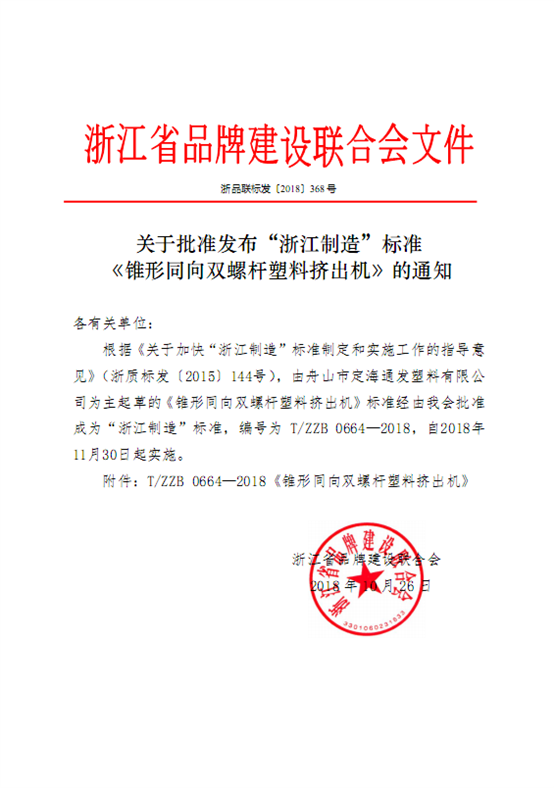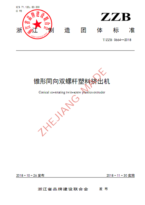 近日,由我公司為主起草的《錐形同向雙螺桿塑料擠出機(jī)》“浙江制造”標(biāo)準(zhǔn)由浙江省品牌建設(shè)聯(lián)合會(huì)批準(zhǔn)發(fā)布實(shí)施,標(biāo)準(zhǔn)編號(hào)T/ZZB 0664-2018,該標(biāo)準(zhǔn)自2018年11月30日起實(shí)施。